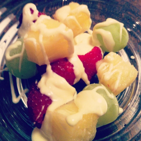 Mozzarella&tomat till förrätt, nötbiffar med potatis till huvudrätt också hallon/druvor/ananas med vit smält choklad till efterätt. Så himla duktigt av en 12 åring! Tack så mycket Matilda :)